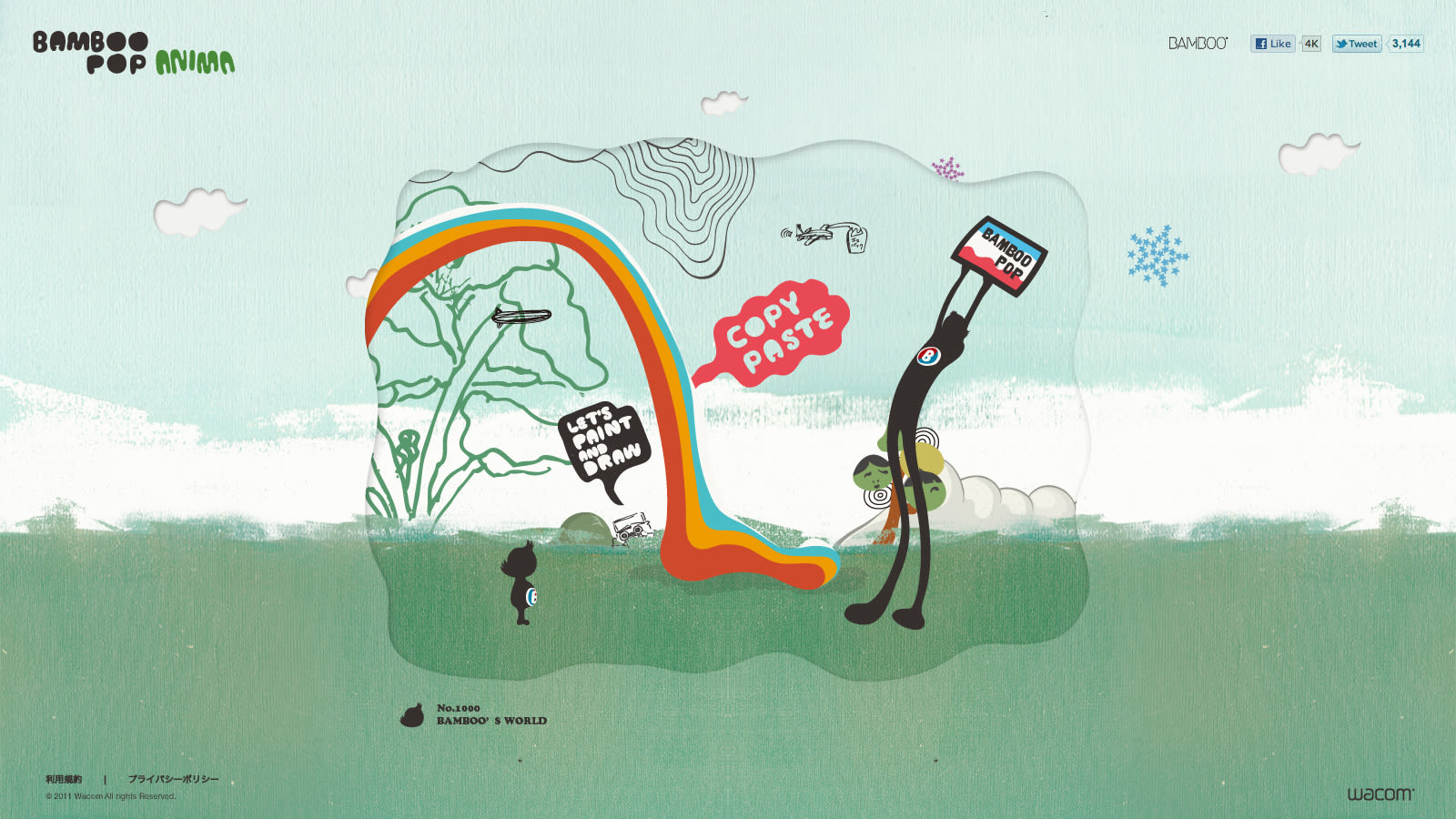 Art direction, key visuals, characters, and other graphic elements for “E Motion," a special website for Wacom's Bamboo pop pen tablet. The site was created with the concept of conveying the joy of drawing to users, allowing them to draw pictures using simple tools, and animate them by breathing life into them. The pictures you create are evaluated by the characters with various animated reactions. The site is also linked to SNS, allowing users to create worlds with friends and give them as gifts, further spreading the excitement. The background of the graphics created for this project is the same as that of the Bamboo pop brand website, painted with acrylic on canvas to create a sense of unity. The character was created using frame animation to express smooth movement. Good Design Award winner.