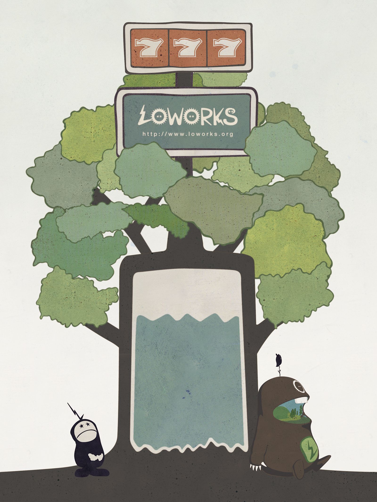 Loworks two original characters play around the tree. The amount of water in the center of the tree represents the amount of battery and the slot at the top represents cell phone reception.